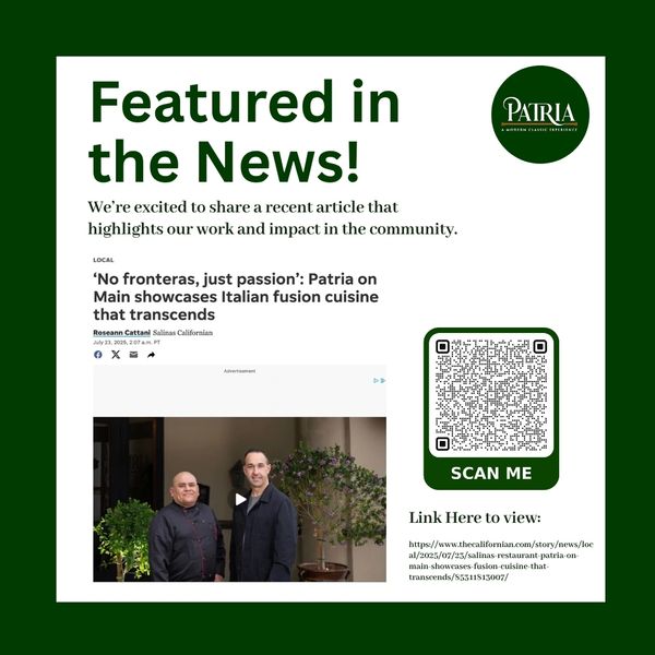Tucked into the heart of Oldtown Salinas, Patria on Main is a vibrant bistro where every dish tells a story of seasonal freshness and culinary passion. Hand-selected local ingredients take center stage, transforming into artfully crafted dishes that celebrate the bounty of Monterey County and beyond. From farm-fresh produce to locally sourced meats and seafood, Patria on Main’s menu is a love letter to the changing seasons and the flavors they bring.